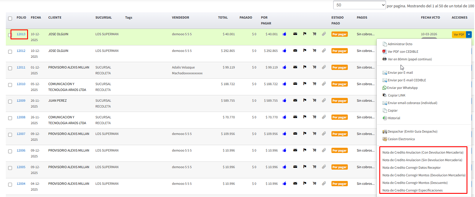 Una vez ubicada la factura a la cual le emitira la Nota de Credito, en la columna Acciones, haga click en la flecha azul, la caul le mostrar varias opciones para la Nota de Credito, selecciones la que usted necesite.