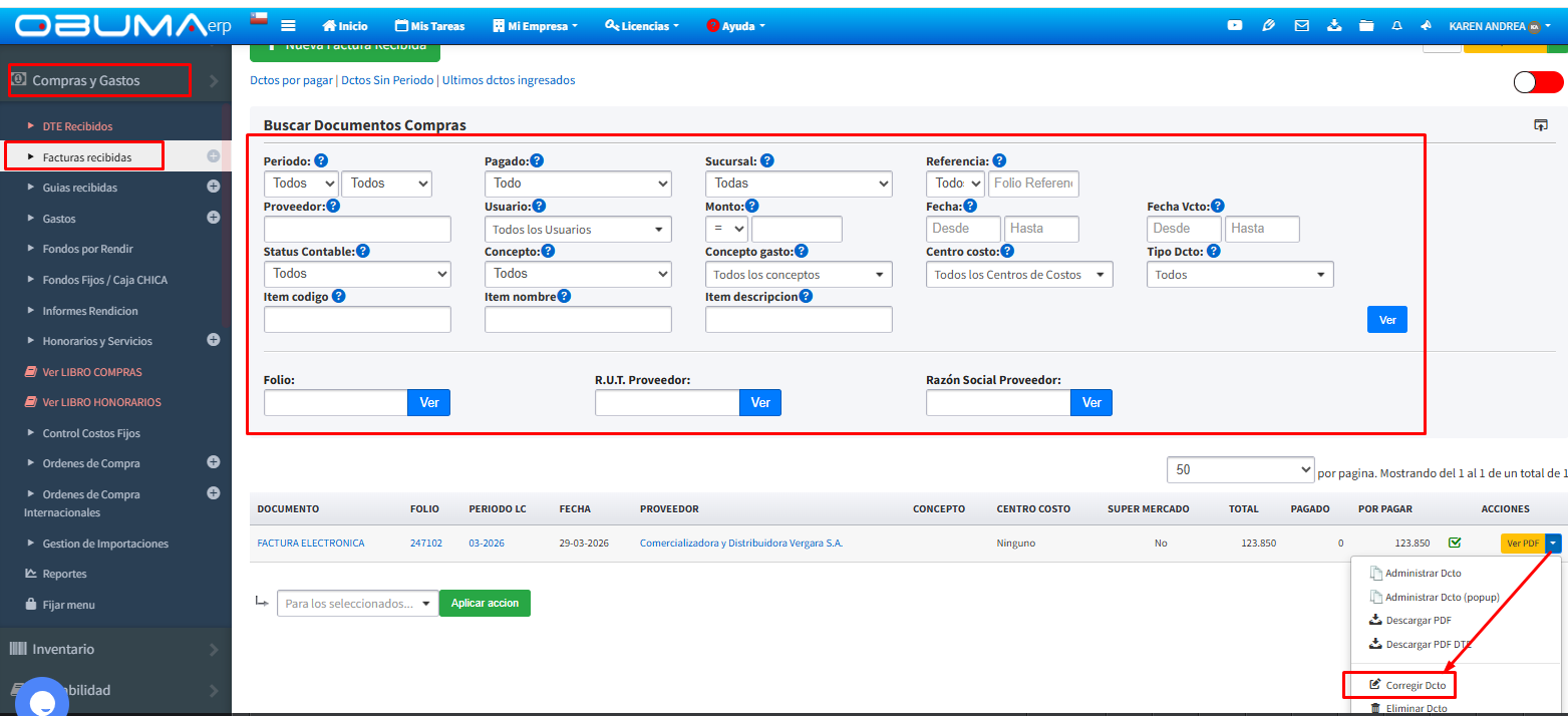 - Desde Compras y Gastos -> Facturas Recibidas Ubicar la factura de Combustible por cualquiera de las formas para buscar documentos que tiene el sistema.