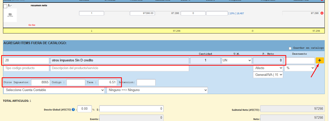 - Impuesto Específico, Cantidad 1, Precio Unit 0, y en Otros impuestos se coloca el monto del impuesto específico, de esta forma queda como impuesto “Sin derecho a crédito fiscal” y se presiona el signo + para ingresarlo