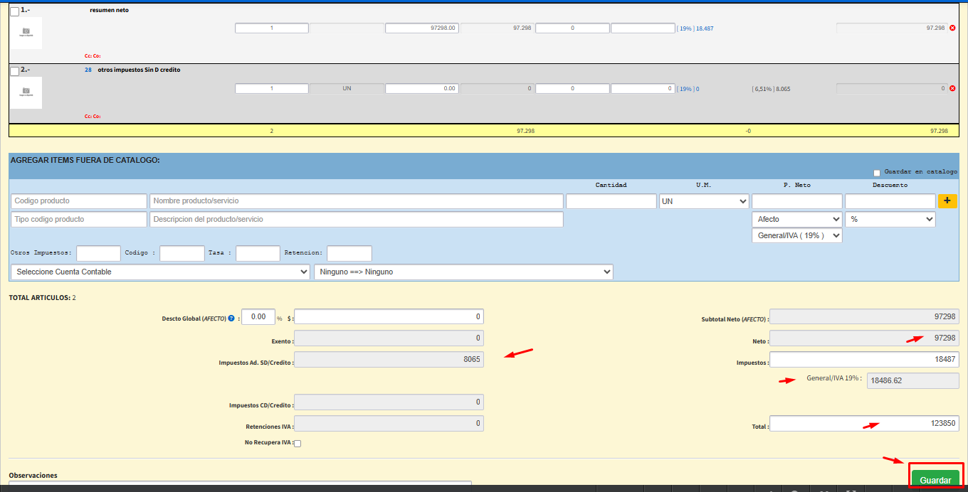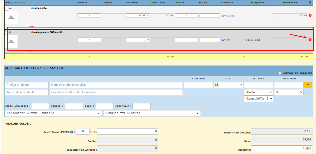 - Borrar los ítems para que no consideren el impuesto adicional, ya que el sistema lo coloca como Impuesto con “Derecho a crédito fiscal”.
