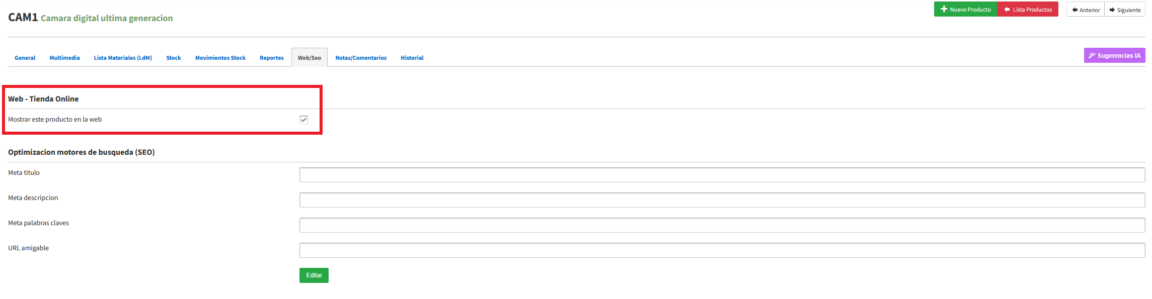 En la siguiente imagen se muestra cómo habilitar un producto para la web desde la ficha del producto en OBUMA.