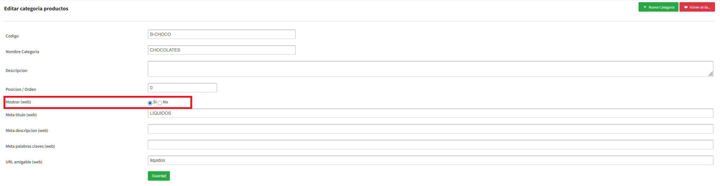 - Si la casilla “Mostrar en la web” está habilitada, la categoría será incluida en la sincronización solo si en el plugin también se ha activado la opción para sincronizar categorías visibles en la web.