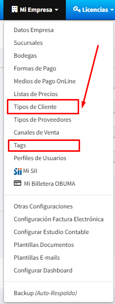 Para crear los tags y tipos de clientes, se hace desde el menú superior Mi empresa > Tipos de Cliente ó Tags