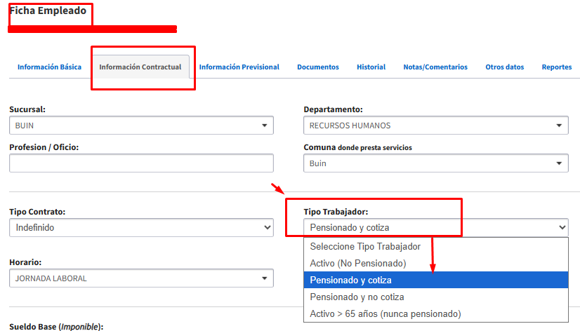 - En la ficha del trabajador -> Información contractual, marcar en el campo Tipo de Trabajador: PENSIONADO Y COTIZA