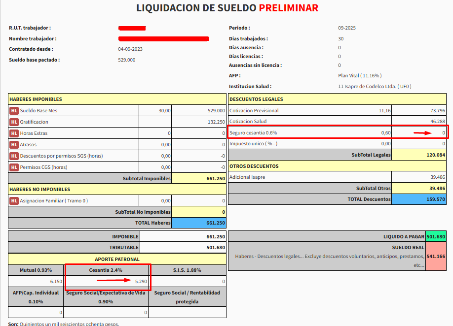 Ejemplo: Seguro de Cesantia del trabajador = $ 0 (Aplica para tipo de contrato a Plazo fijo e Indefinido)