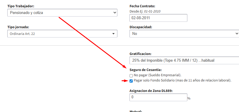- En la misma ficha del trabajador -> Información contractual, Seguro de Cesantia: tildar en el recuadro Pagar solo Fondo Solidario (mas de 11 años de relación laboral). GUARDAR