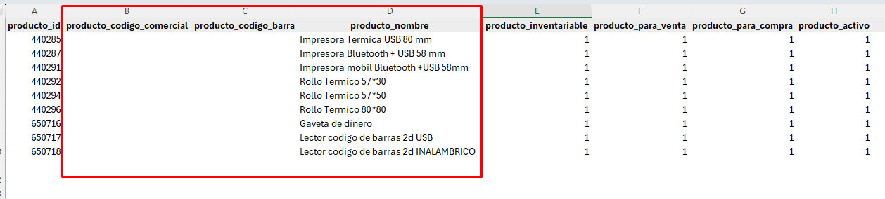 En este caso, vamos a dejar a modo visual los datos del código y nombre del producto y los eliminamos antes de guardar para no actualizarlos, o bien los puedes dejar, solo debes saber que se actualizan todos los campos informados.