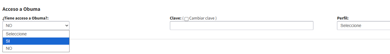 - Marcar la opción "Accede a OBUMA", asignar un perfil de usuario y una clave.
