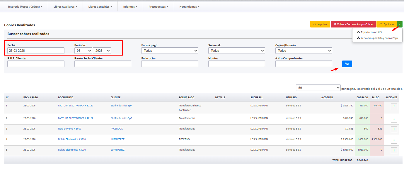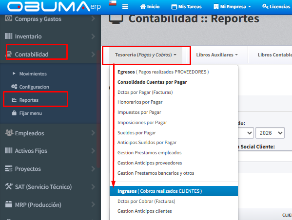 Sigue la ruta dentro del sistema: Contabilidad → Reportes → Tesorería (Pagos y Cobros) → Ingresos Cobros realizados (CLIENTES)